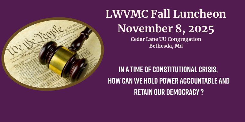 Join us on November 8, 2025 for the annual LWVMC Fall Luncheon. Our luncheon speaker, Ellen Weintraub Esq, former commissioner and chair of the Federal Election Commission, will discuss how we can be aware of and effectively counter interference and voter suppression in the run-up to the 2026 federal elections. In the current atmosphere of declining trust in fair elections, Ms. Weintraub will share her perspective on how to hold power accountable for preserving the rule of law, checks and balances, and democratic norms. Plan to attend and learn more about how together we can have an impact.